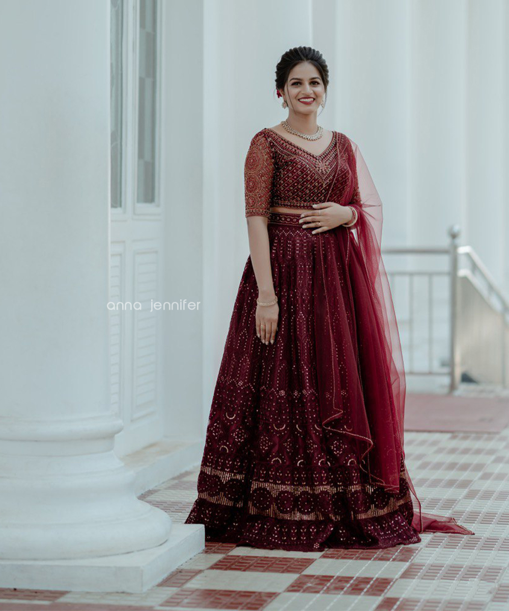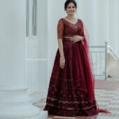 Features detailed Zardosi handwork at the skirt joint area, adding richness to the ensemble. Side pleats are intricately worked to provide texture, elegance, and movement. The design ensures a graceful silhouette while maintaining traditional luxury.